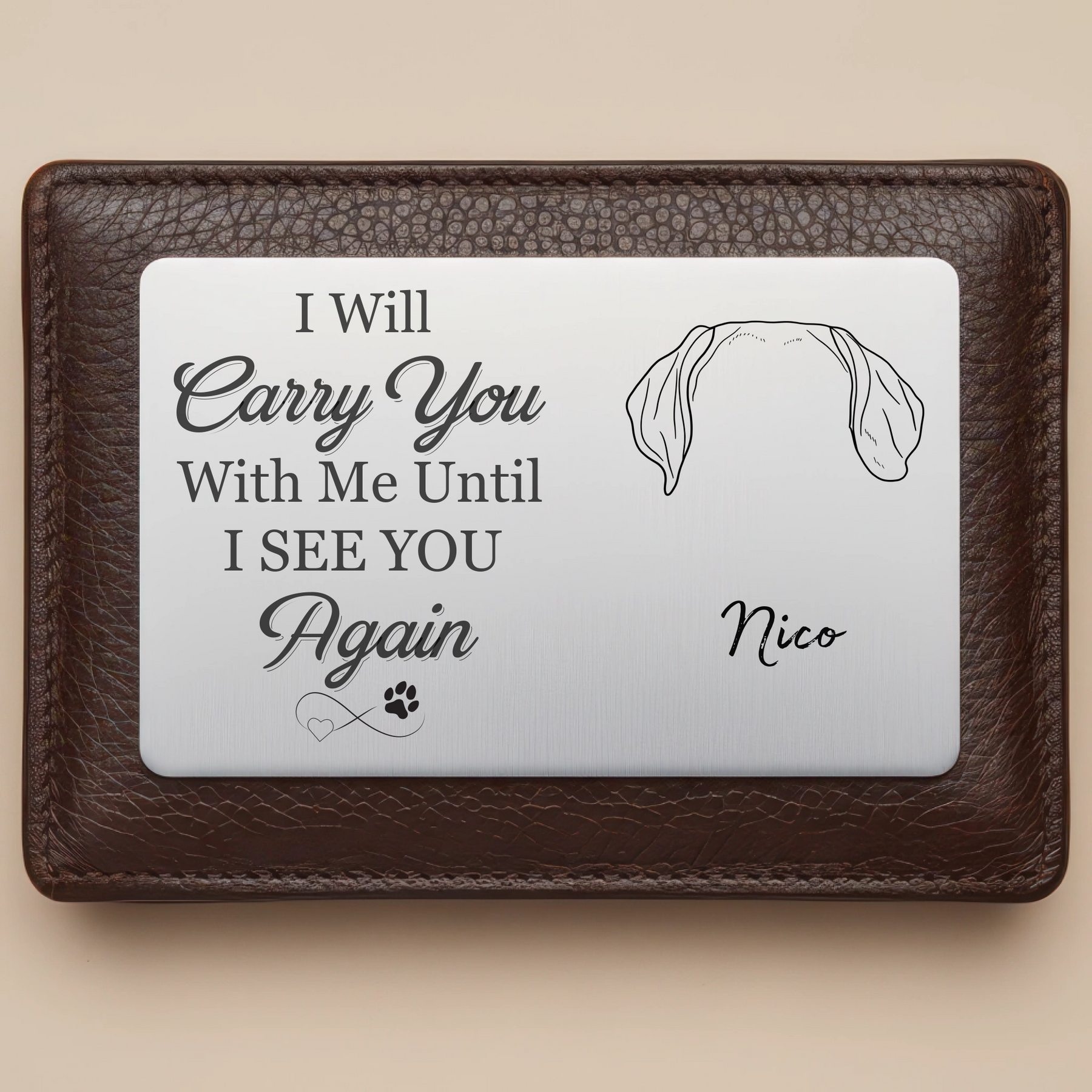 Honor the memory of your loyal companion with this personalized aluminum wallet card, designed especially for dog lovers. Slim, durable, and easy to carry, this keepsake features a custom dog breed ear outline, your dog’s name, and a heartfelt memorial quote. It’s a pocket-sized tribute that ensures their love stays close, no matter where you go.