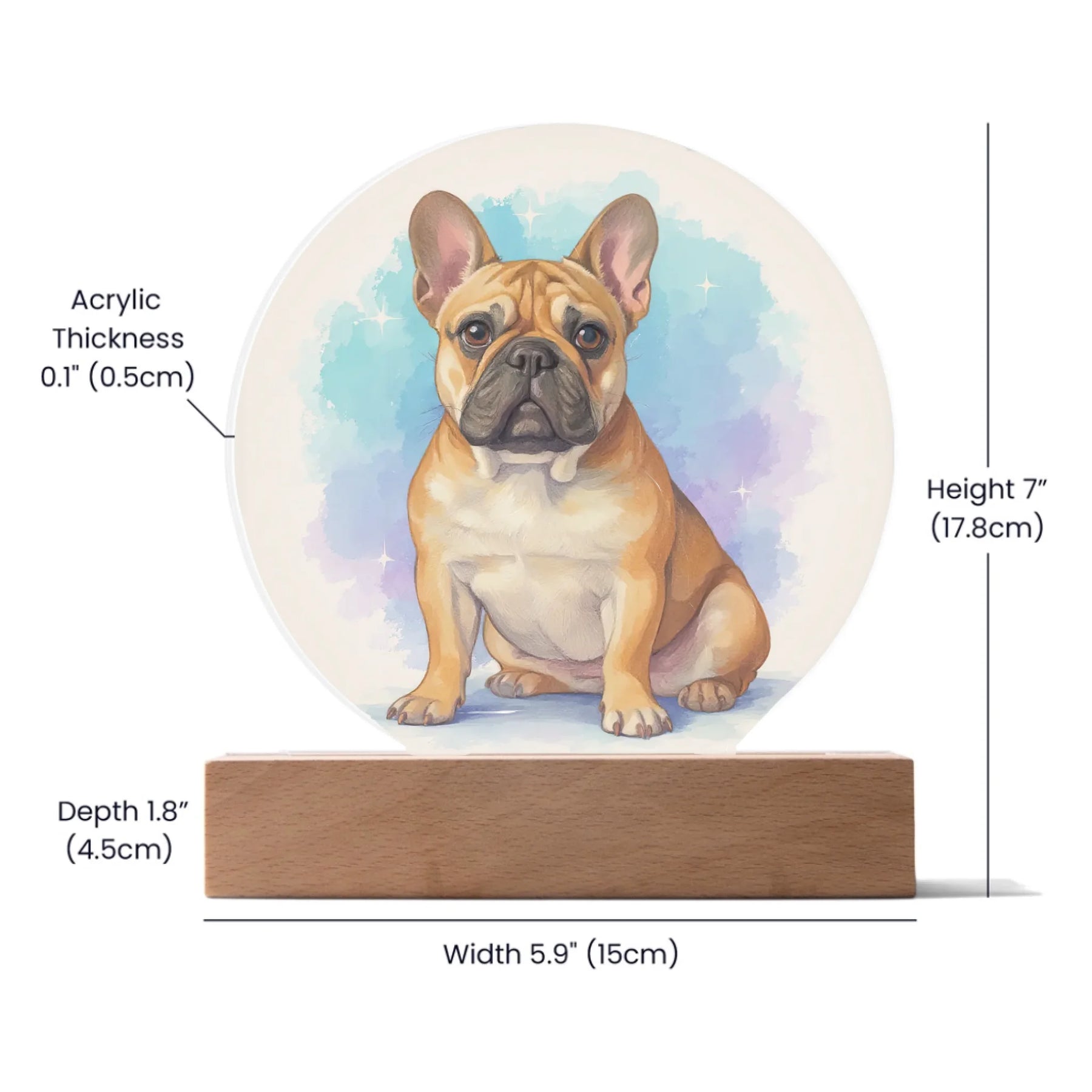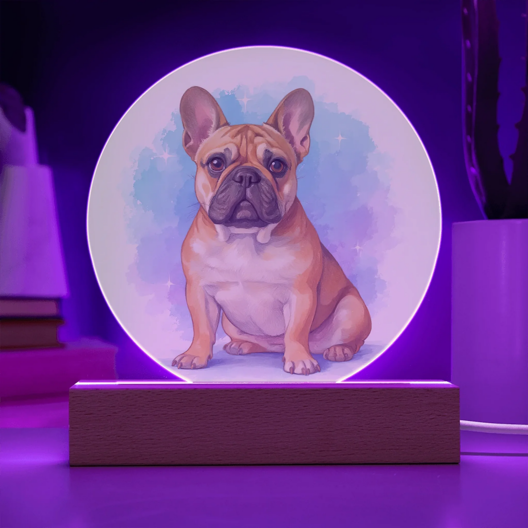 Soft pastel pet portrait LED acrylic circle plaque with French bulldog illustration glowing on wooden base