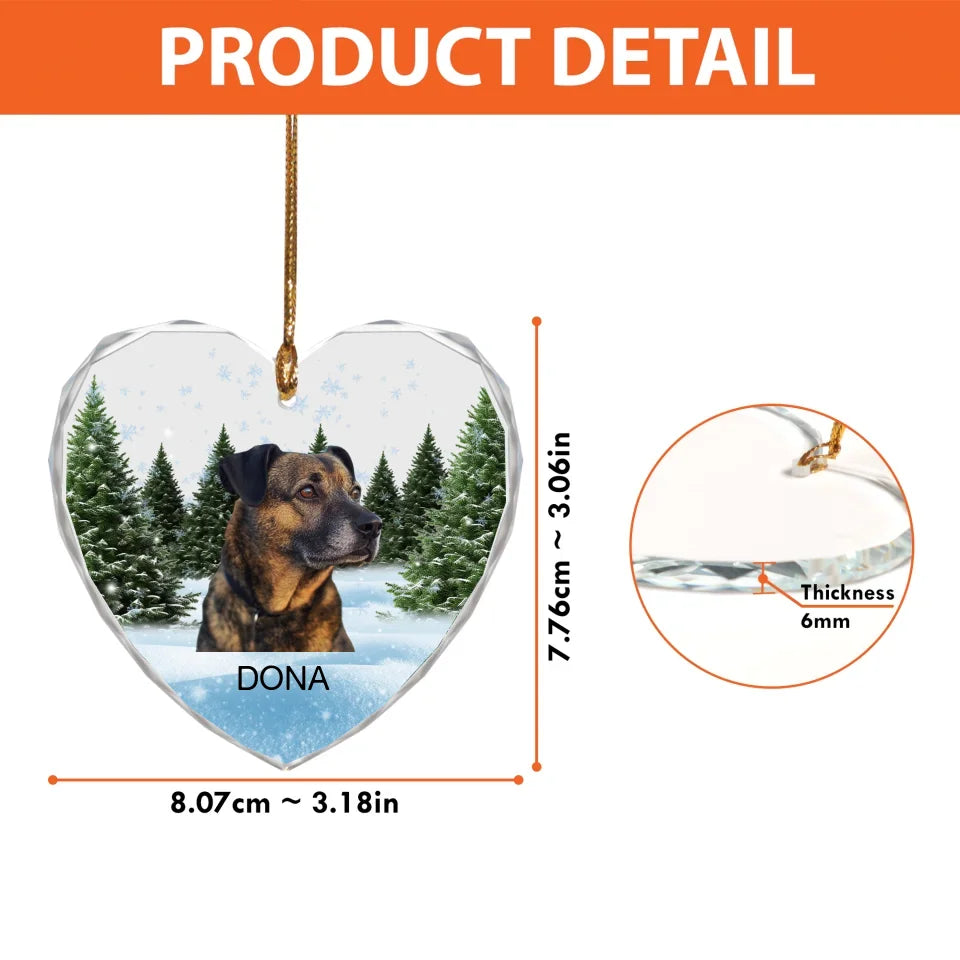 Heart-shaped glass ornament featuring a photo of a pet, surrounded by a winter forest scene, ideal as a pet memorial keepsake